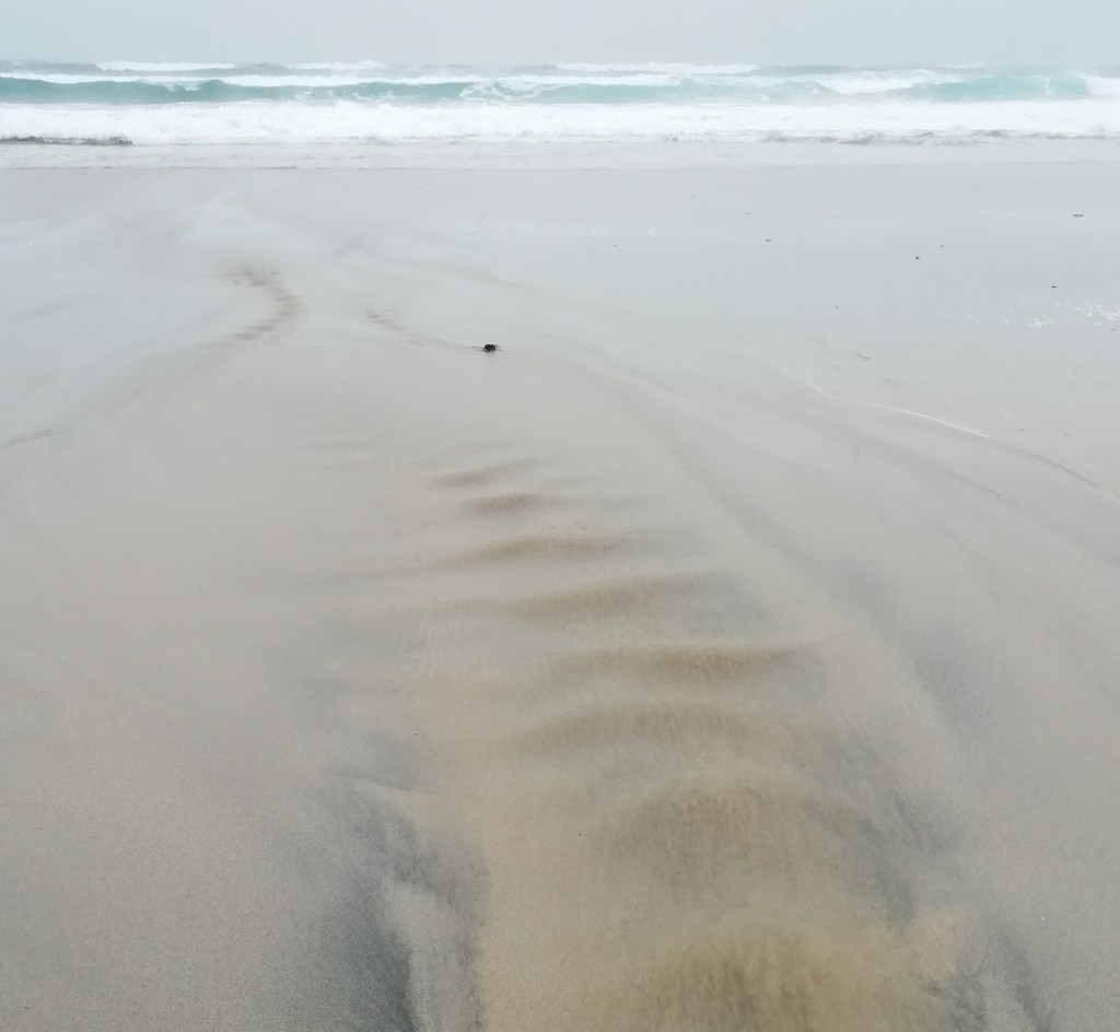 By the time we reach the dunes it is the luminous half hour that can only happen on days with no sun. Light seems to seep upwards from the ground illuminating, or emanating from, the understorey beneath the marram grass. Dandelion leaves shimmer, a small unidentified sedum glows blue and here and there tight clumps of lime green sphagnum moss shine like tiny neon beacons. I walk slowly, partly because the sand gives way sideways beneath my feet and partly because I can hear something battling with the roar of the sea. The weakening light is amplified at the sea’s edge but it does not reach far beyond the fringe of the dunes, and dusk breathes heavily on one side of us. But it is filled with birdsong. I can make out a blackbird’s simple but poignant voice. But there are others that I do not recognise. I pause to scour the darkness of the hill, the little bodies beside me seize this opportunity to disappear into the whispering grass, diving headfirst down the steep dune slopes. The unseen, unknown bird has a haunting call. It is a hooting, wavering cry. I think it might be a Curlew at first, but it isn’t quite right. I cannot hear it clearly enough beneath the endless rush of ocean-whipped sound. Perhaps it is a golden plover? I know they have been spotted here. I continue to listen, staring fruitlessly into the darkness. Soon even the sphagnum moss has lost its shine and the dusk sweeps over us to the lip of water, two tides meeting.