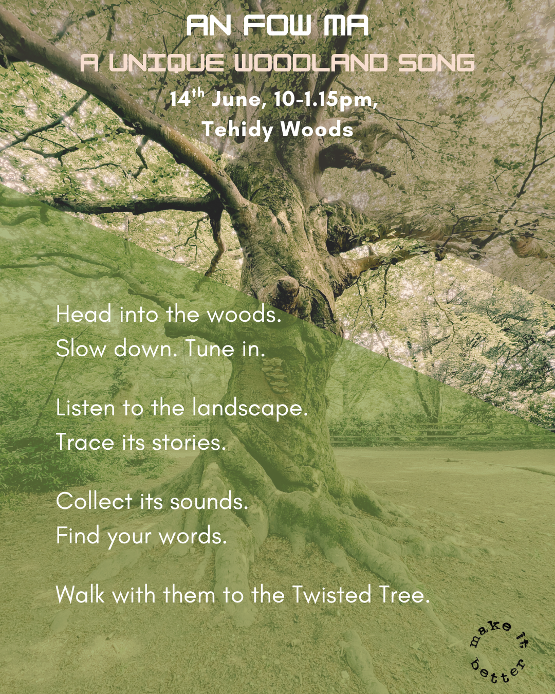 You don’t need to be a singer or a poet. By listening and responding to the woods through sound and words, together we will create a truly unique woodland song.